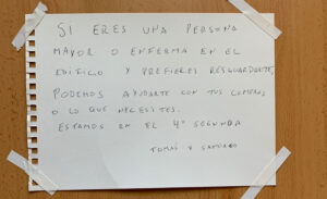 Gli argentini Tomás e Santiago vivono a Barcellona, nel quartiere dell’Eixample. Il primo è un giornalista, lavora per una società di calcio francese e sta facendo un corso di specializzazione, il secondo ha una laurea in marketing e lavora per una multinazionale. I due giovani, pur proseguendo la loro routine lavorativa da casa, grazie allo smart working, hanno pensato di rendersi disponibili, come tanti altri giovani in diverse parti del mondo, nel loro condominio, per andare a fare la spesa per i loro vicini, in particolare per chi è più anziano, malato o preferisce rimaneere a casa.